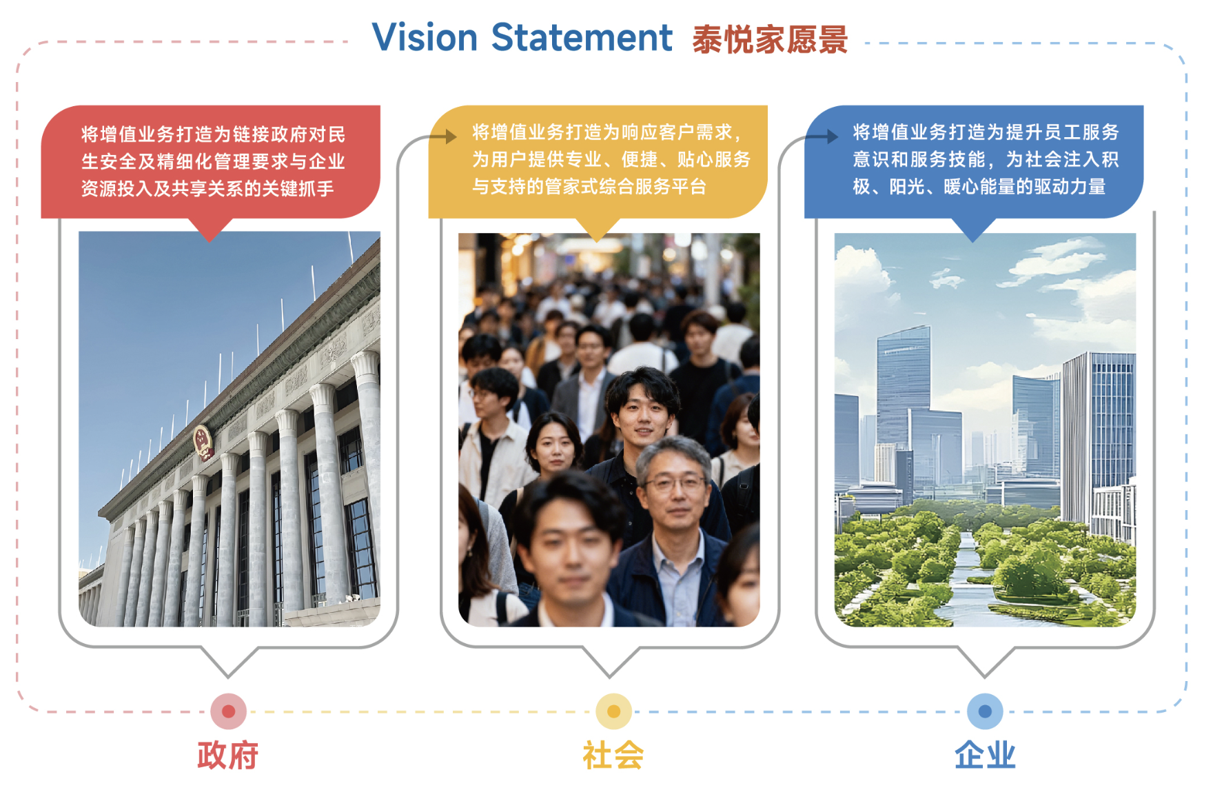 難能可貴的是,泰悅家公司在充分融合社會關注、民生訴求和企業自身發展的基礎上構建了公司發展願景,明確要將增值業務打造為鏈接政府對民生安全及精細化管理要求與企業資源投入及共享關係的關鍵抓手;打造為響應客戶需求,為用戶提供專業、便捷、貼心服務與支持的管家式綜合服務平臺;打造為提升員工服務意識和服務技能,為社會注入積極、陽光、暖心能量的驅動力量。
